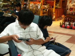 | 約束の時間は6:45 ちゃんと5分前にはタクシーの運ちゃん、来てくれました(^-^) 荷物を乗せて空港へ向かいます。空港までは100000RPだとタクシーの運ちゃん。 早朝なのでその金額が妥当だと言ってました。 でも、もうすでに残りのルピアが少なくて…足りなかったのよ。 ということで、¥1000に値切った私達(汗) 値切られて気分を害したのかクセなのかはわかりませんが、とぉ〜っても荒い運転のタクシーでした。 無事空港へ到着し、セキュリティを通り長蛇に並んだキャセイのチェックインカウンターへ並びます。 しばらく並んでいると、エグゼクティブチェックインカウンターのおじさんが手招きしてくれました。 子連れ?だったからなのかな? 優先的にチェックインをさせてくれたんですよ。 シートリクエストは事前にお願いしていたとおり、しっかり通ってました。 空港税100000RP×4人分も支払い出国。Departureに向かいます。 空いているベンチを陣取り、昨日買っておいたパンやクッキーで朝食です。 子供達は相変らずゲームに夢中。何処へ行ってもゲームだよ。。。 |