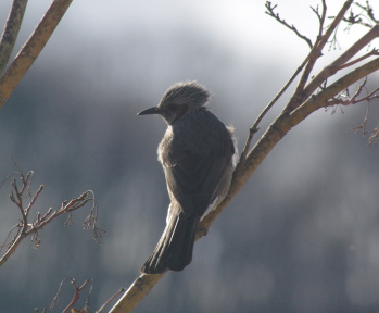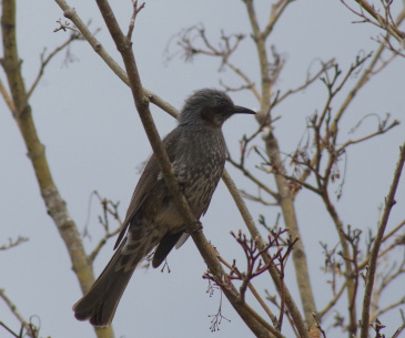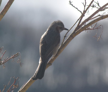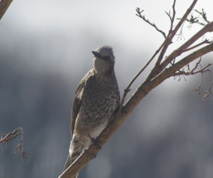 ヒヨドリ ボサボサ頭に茶色いホッペ。庭の餌台のリンゴを美味しそうについばんでいます。鳴き声は「ピイピョロロ」「ピーヨ」など