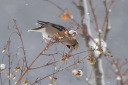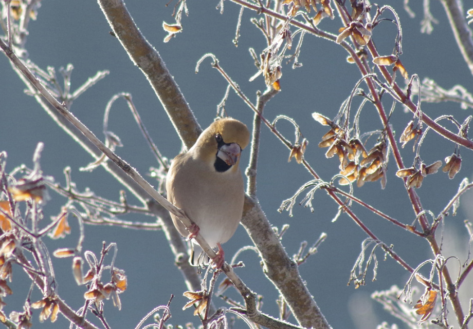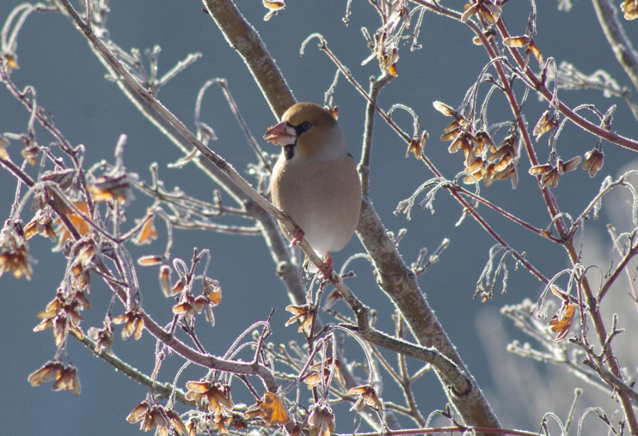 シメ 太いくちばしで木の実を割る。ずんぐりとした鳥。北海道で繁殖し、本州以南で越冬する。