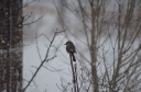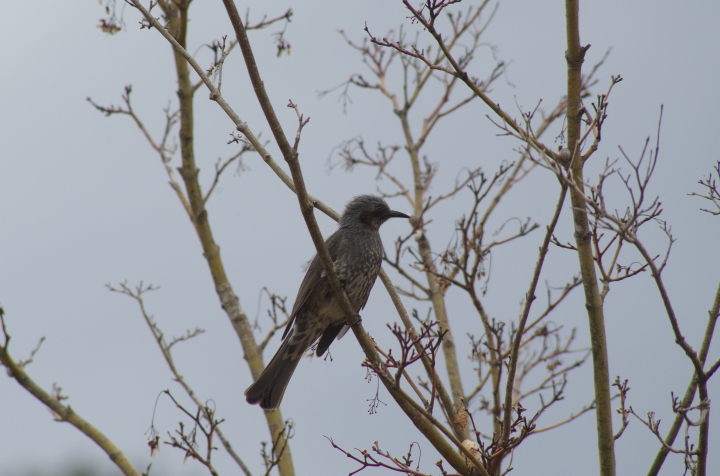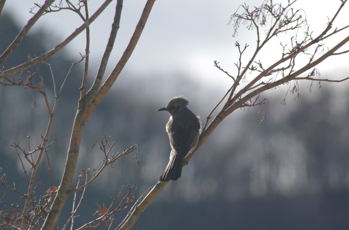 ヒヨドリ ボサボサ頭に茶色いホッペ。庭の餌台のリンゴを美味しそうについばんでいます。鳴き声は「ピイピョロロ」「ピーヨ」など