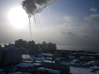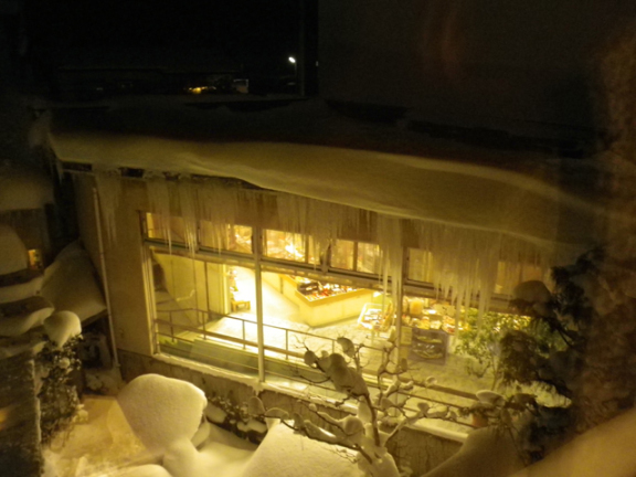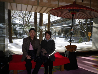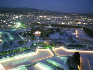 早速、五稜郭が一望できる「五稜郭タワー」に上る。上空から見る五稜郭は、ライトアップされており、星型が綺麗に浮き上がっていた。函館は、正月明けに40pもの大雪に見舞われたとのこと。タクシーの運転手さんは驚いた様子も見せずに、宿舎の湯の川温泉「啄木亭」へ案内してくださった。