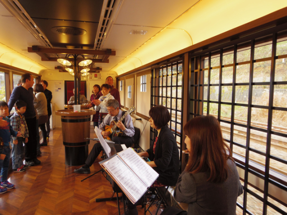 十日町駅14:48発の「越乃Shu*Kura」に乗車。車内ではジャズの生演奏や十分杯の実演など興味を引く催しがあり楽しい列車旅でした。